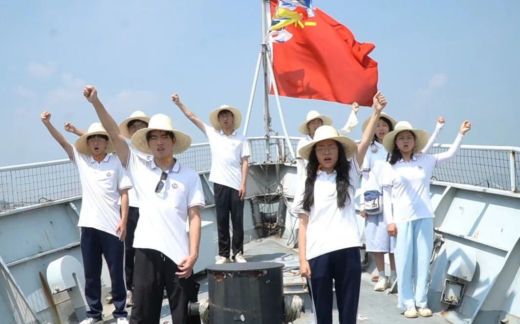 在舰艏,面对滚滚东流的长江,实践队员列队肃立,发出铿锵青春宣言:“九江舰告诉我们,火力是盾牌,青年是握盾的手!从‘火力支援’到‘科技强军’,这是我们的接力——青春与战舰同框,同框的是,守护的意志!”“青春守护,强军有我!”“以青春之名,铸和平之盾!强国有我!”震天的誓言与猎猎飘扬的八一军旗交织,队员们的手臂仿佛化作了奔涌的浪潮,将强国强军的信念坚定地熔铸于时代洪流。