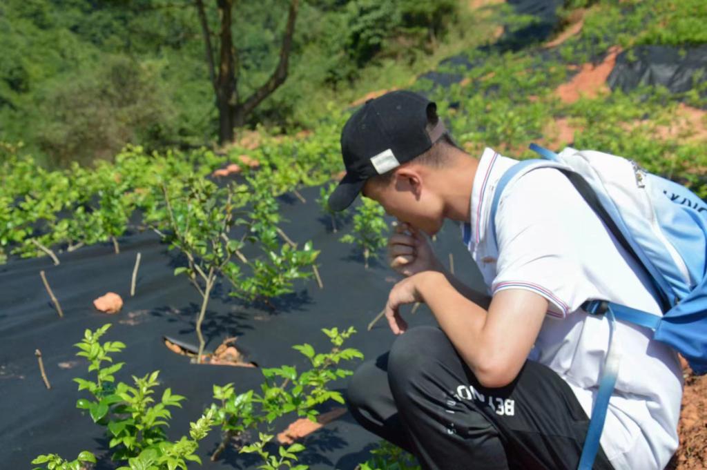 图为文炎带领社会实践团前往藤茶种植基地并为社会实践团成员详细介绍藤茶产业的发展。中国青年网通讯员 颜悦 供图