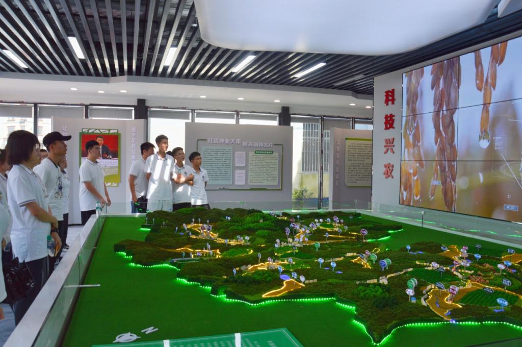 图为社会实践团观看排上镇杂交育种的记录短片及杂交水稻制种田的沙盘图