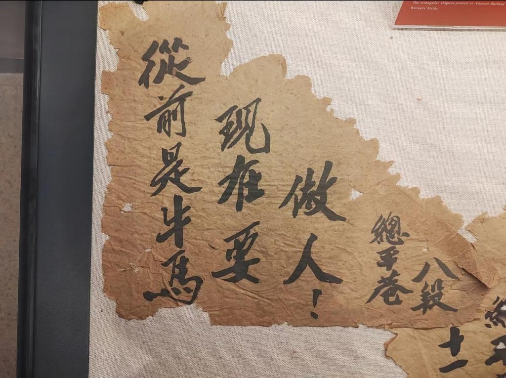 图为写着“从前是牛马,现在要做人”口号的三角旗