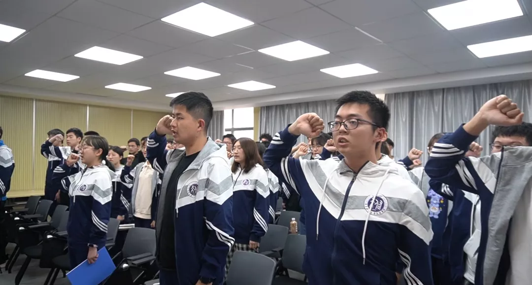 全体“天佑学子”面朝神圣的团旗,在何政毅同学的带领下再一次紧握右拳,重温入团誓词。