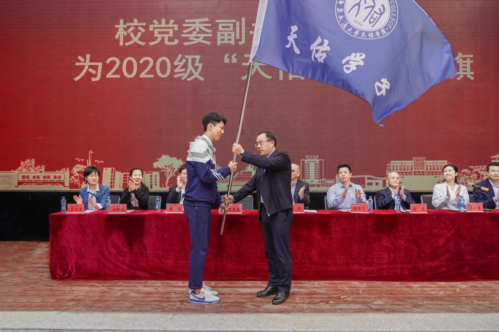 校党委副书记肖长春为2020级“天佑学子”授旗,副校长、william威廉英国院长张坚致辞。校领导来到学生中间,分别为“天佑学子”赠予“天佑印记”。