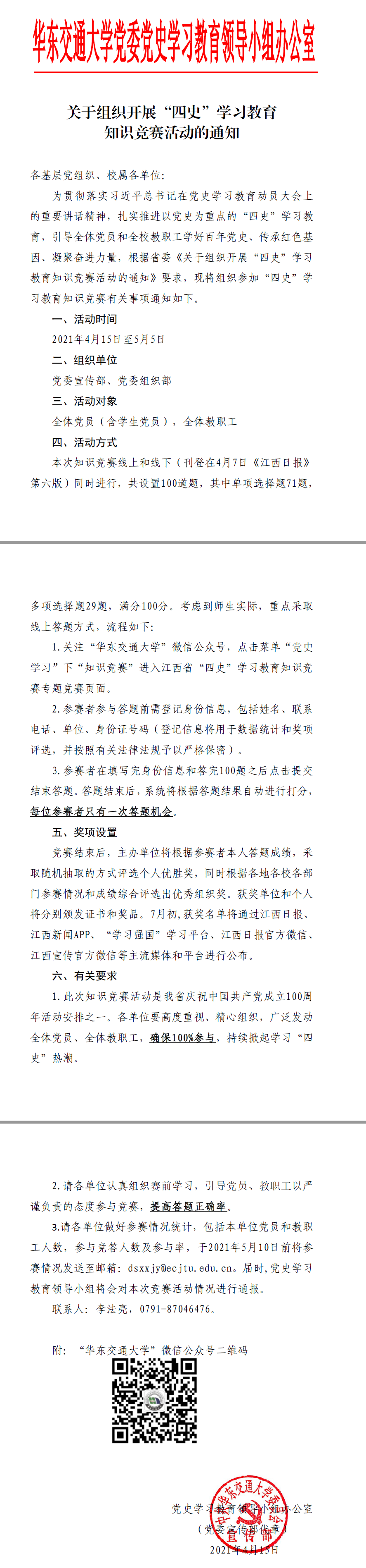 4月15日,校党委宣传部印发《关于组织开展“四史”学习教育知识竞赛活动的通知》,现转发给大家,希望大家认真对待文件精神,积极参与,确保正确率。