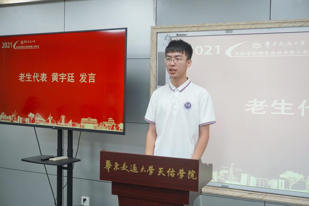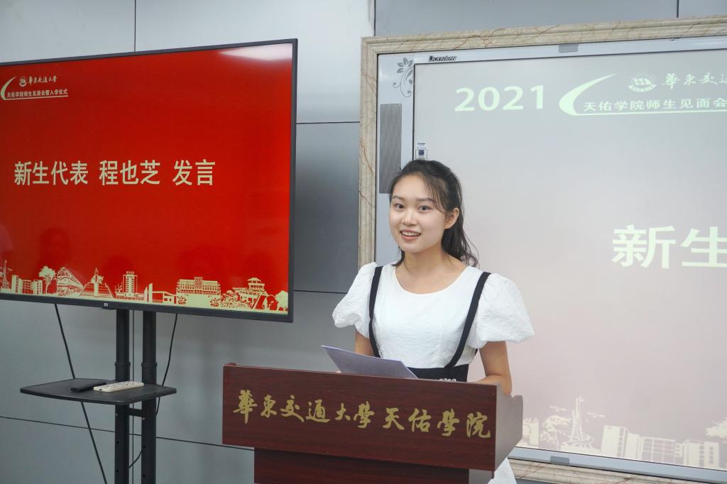 王冰雪代表学院对2021级“天佑学子”的入学表示欢迎,并寄语新生百尺竿头、更进一步,用刻苦努力回应全校师生的期盼和寄望。2020级“天佑学子”代表黄宇廷和2021级“天佑学子”代表程也芝分别发言,与大家分享了自己的成长故事,并带领新生集体许下铮铮誓言,立志做好“天佑传人”。