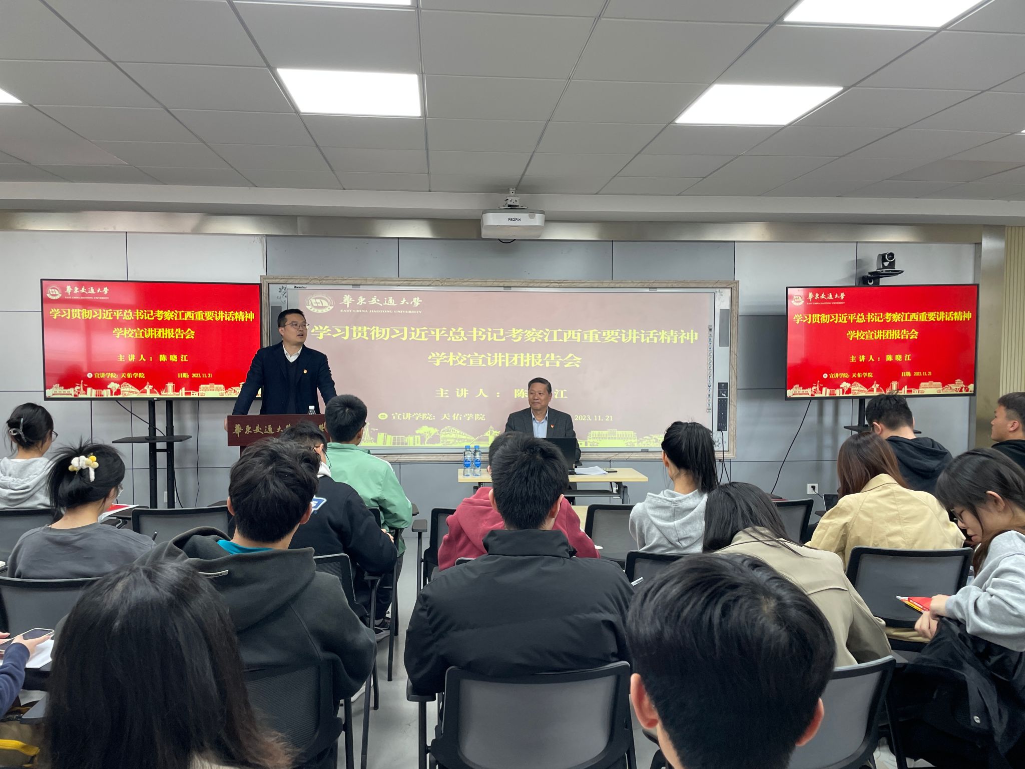 陈晓江老师深入阐释了习近平总书记考察江西重要讲话精神的时代背景、重大意义、丰富内涵和实践要求。在一个小时的宣讲中,陈晓江老师紧紧围绕深刻认识习近平总书记对江西人民的深情厚爱、深刻把握习近平总书记再次考察江西的重大意义、深刻把握习近平总书记对江西发展提出的新的战略定位、深刻把握习近平总书记对江西发展提出的任务要求等四个方面,作了全面系统、深入浅出的阐释。