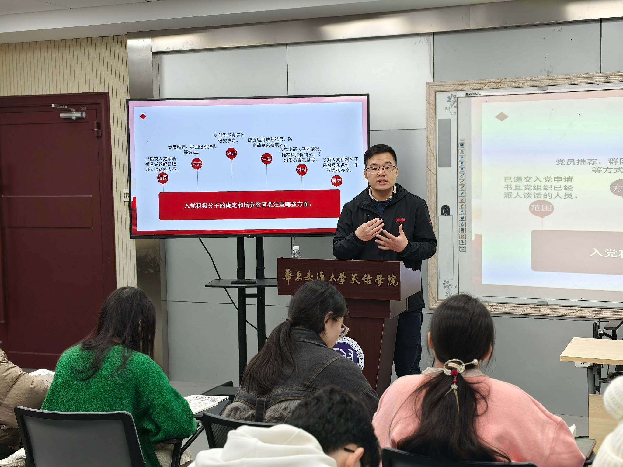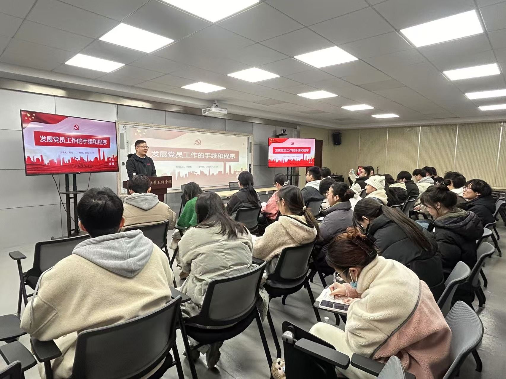郑伟从递交入党申请书出发,详细讲解了党员发展过程中每一步的具体内容,以工作中的具体事件为例,解释不同学院因其自身情况的特殊性导致党员发展材料在不同的环节上存在细小的差别,并带领同学们从较复杂的流程归纳提炼“三次谈话”、“两次大会讨论”等核心重点,使同学们由繁化简,短的时间内较快把准党员发展基本要点,同时,结合“中国共产党发展党员工作流程图”进一步强调规范党员发展的重要性。
